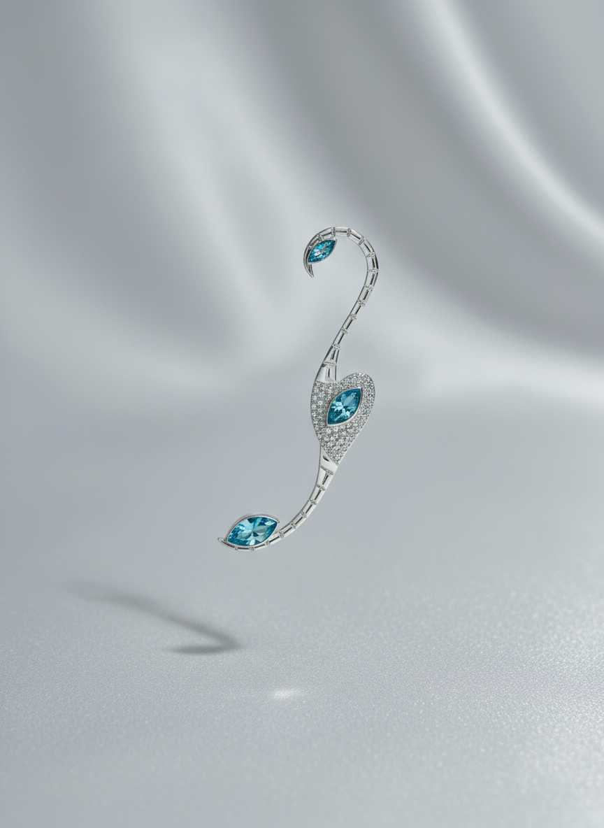 DETAILS Materials: 18k white gold, 118 diamonds – 18 emerald cuts and 100 round brilliant, with 3 Paraiba tourmalines. Type: Climber earrings, unisex multi-wear concept. Finish: High-polish with smooth stone inlays, hyper-light and comfortable. A high jewellery, bespoke creation.